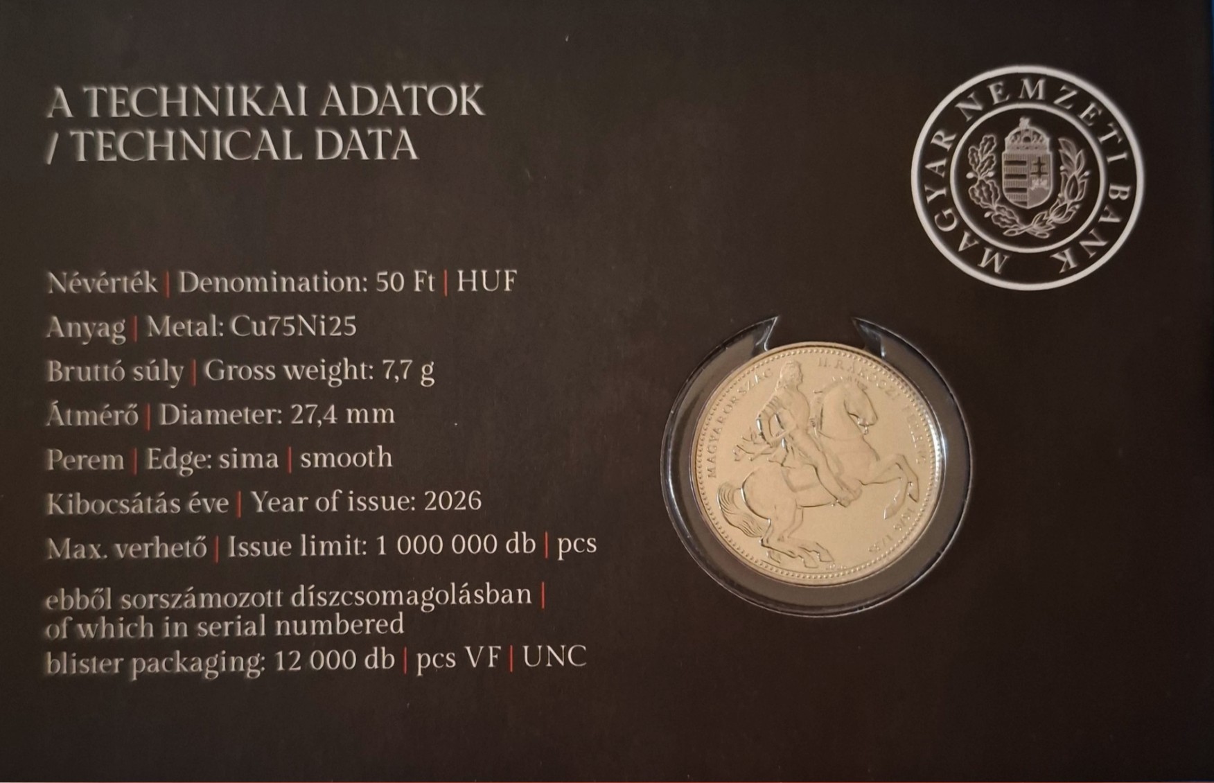 Leírás: 2026-os első napi veret a II. Rákóczi Ferenc születésének 350. évfordulója alkalmából! Az első napi veret bliszterben egy 50 forintos emlékveret kapott helyet. Forgalmazta és az érméket verte a Magyar Pénzverő Zrt!